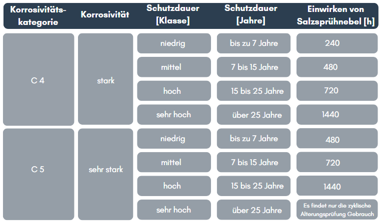 Unsere C5H Beschichteten Produkte bieten effektiven Korrosionsschutz für besonders anspruchsvolle Umgebungen. Definiert nach der Norm DIN EN ISO 12944, schützt sie zuverlässig in Industriellen Bereichen mit hoher Luftfeuchte, aggressiver Atmosphäre und Küstenatmosphäre mit hoher Salzbelastung. Durch ihren mehrschichtigen Aufbau, kann unsere Beschichtung die Lebensdauer von Bauwerken verlängern.